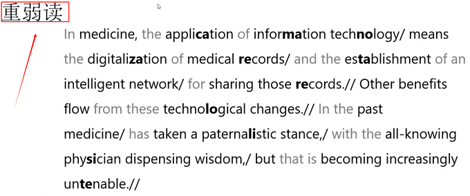 如:In medicine, the application of information technology means the digitalization of medical records,灰色字体为弱读,加粗为重读音节。