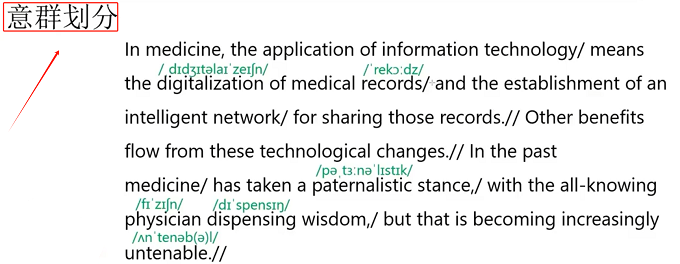 2)意群的划分,文章划斜杠的是意群的划分。in medicine这个地方可以稍微的顿一下,也可以不停顿。