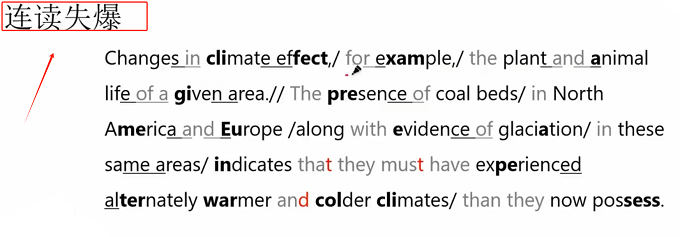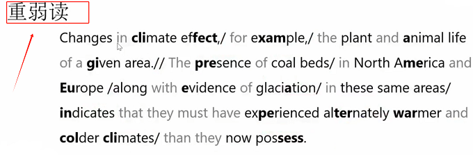 2)再看有加粗字体的音,这些单词音节是要重读的。如:Changes in climate affect,cli的发音及fect的发音是可以重读的。