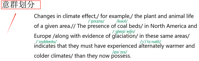 1)首先看到意群部分,从开头到第一句结束area,有几个比较明显的逗号,在这里可以稍作停顿。我们再往后从the presence看到后面,这句话比较长,所以我们要分析一下句子的结构,我们可以优先找介词,在Europe可以稍作停顿。in these same areas indicates 后面有个宾语从句,也可以稍作停顿。再往后,有介词than,所以我们可以在warmer and colder climates后面划分。
