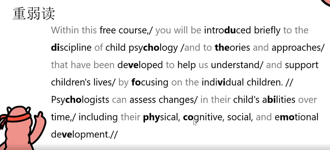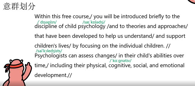 1)下图是关于Child psychology的意群划分示意,可以参照图上一群划分的方式,当然如果想要在developed to后面划分也是可以的。文本最后的并列单词要划分意群也是可以的,但如果考生可以连贯的读出来,那么是可以不做任何的停顿的。